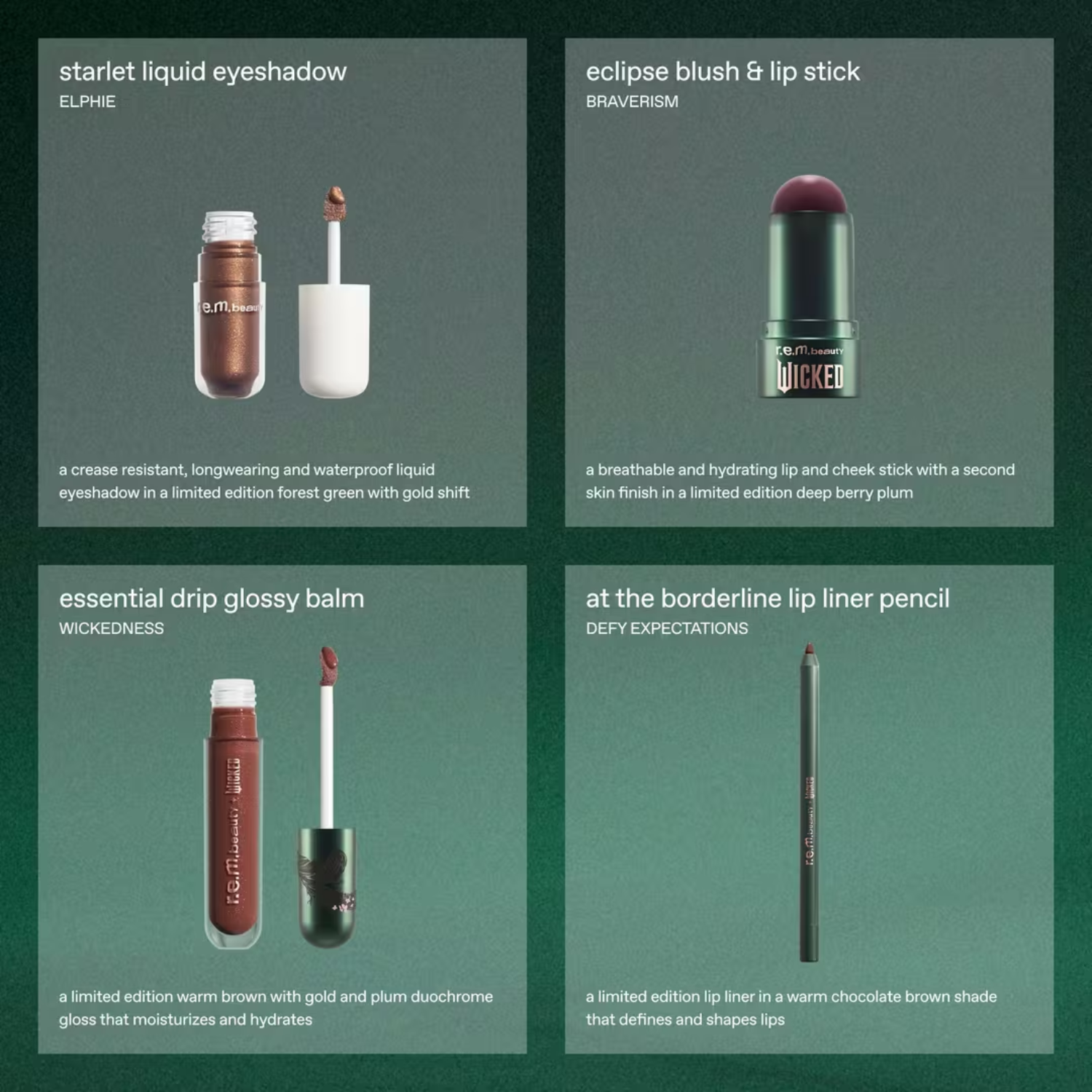 El set de maquillaje Elphaba de r.e.m. beauty es un atractivo set que incluye una sombra de ojos líquida, rubor y lápiz labial, delineador de labios y bálsamo brillante inspirado en la mágica y poderosa paleta de colores de Elphaba.