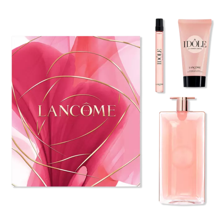 El juego de regalo de fragancias de 3 piezas para el Día de la Madre Lancôme Idôle es un perfume de lujo encapsulado en una silueta dinámica y horizontal que queda plana sobre su tocador para darle un toque de elegancia moderna. Idôle Power Crème es un humectante corporal perfumado con una fórmula liviana y no grasa.