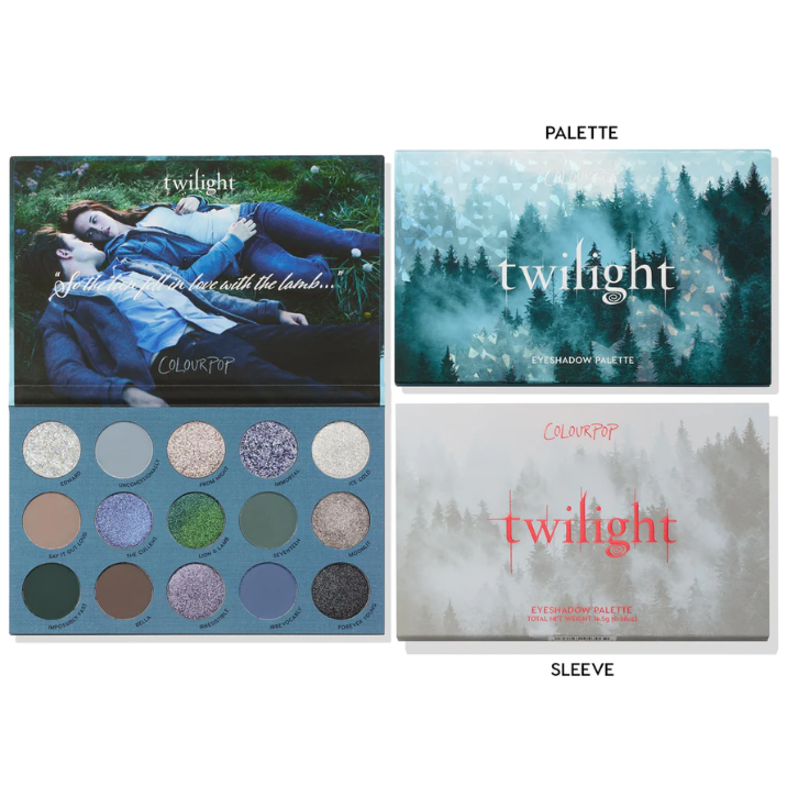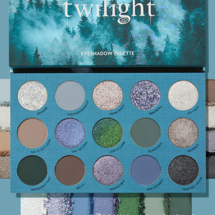 La paleta de edición Crepúsculo presenta 15 azules cambiantes, verdes bosque y neutros fríos y brillantes inspirados en la icónica película.