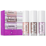 Un set de regalo de tres mini brillos de labios limpios repletos de aceites ricos en vitaminas para una explosión de hidratación, brillo intenso y un color jugoso y semitransparente.