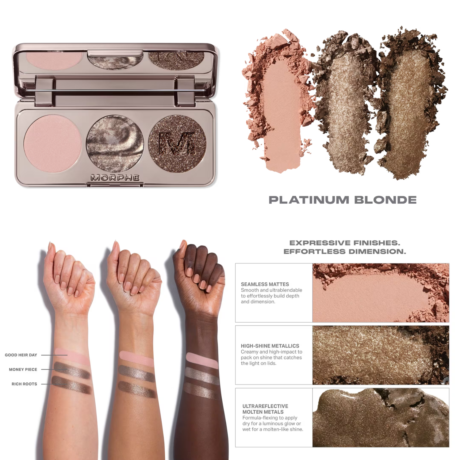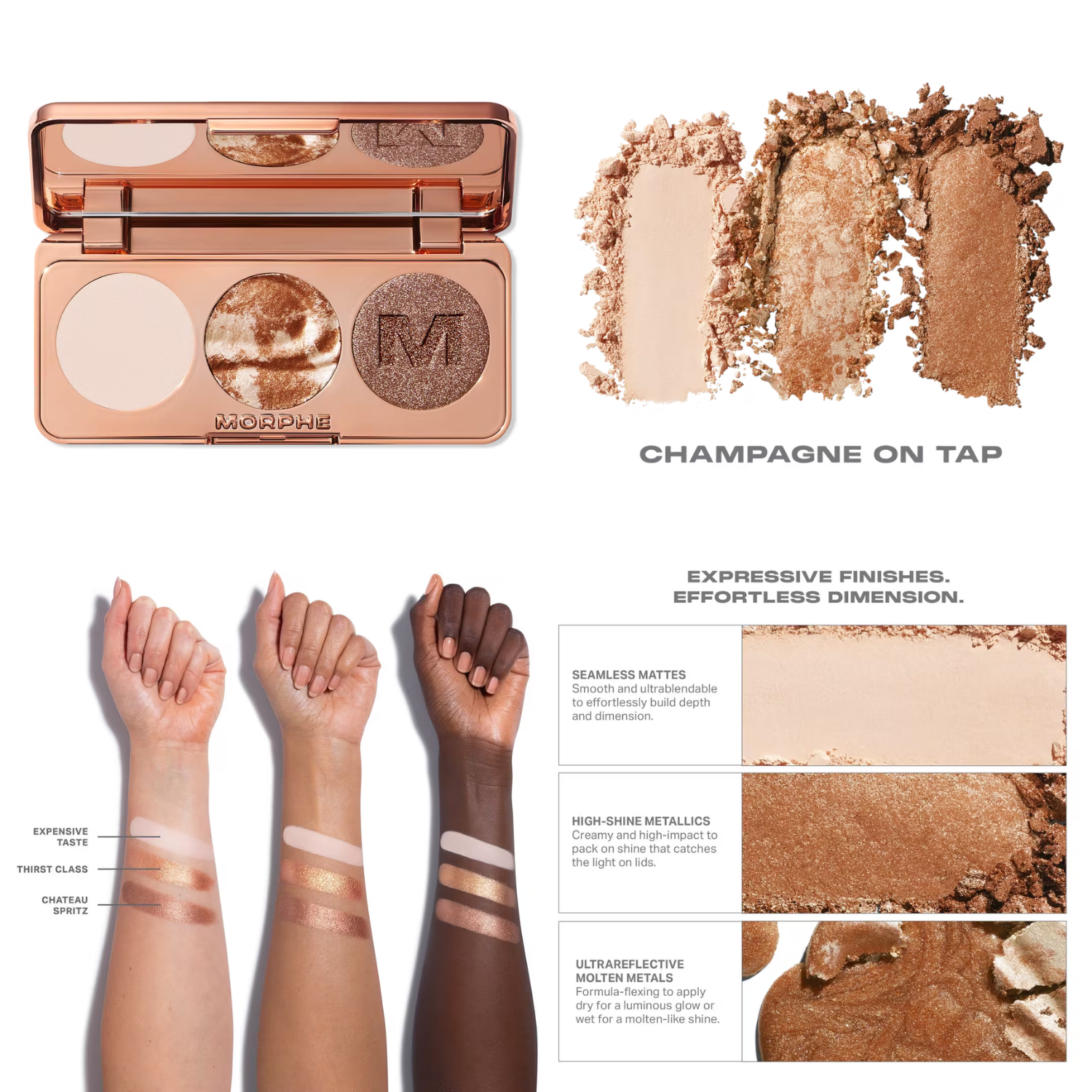 No pierdas de vista el premio con este trío Morphe de acabados mate sedoso, metal fundido jaspeado y brillantes en tonos preciosos y altamente pigmentados. Enriquecido con la mezcla de sombras ChromaPlus para una larga duración, sin pliegues y de alto rendimiento durante todo el día.